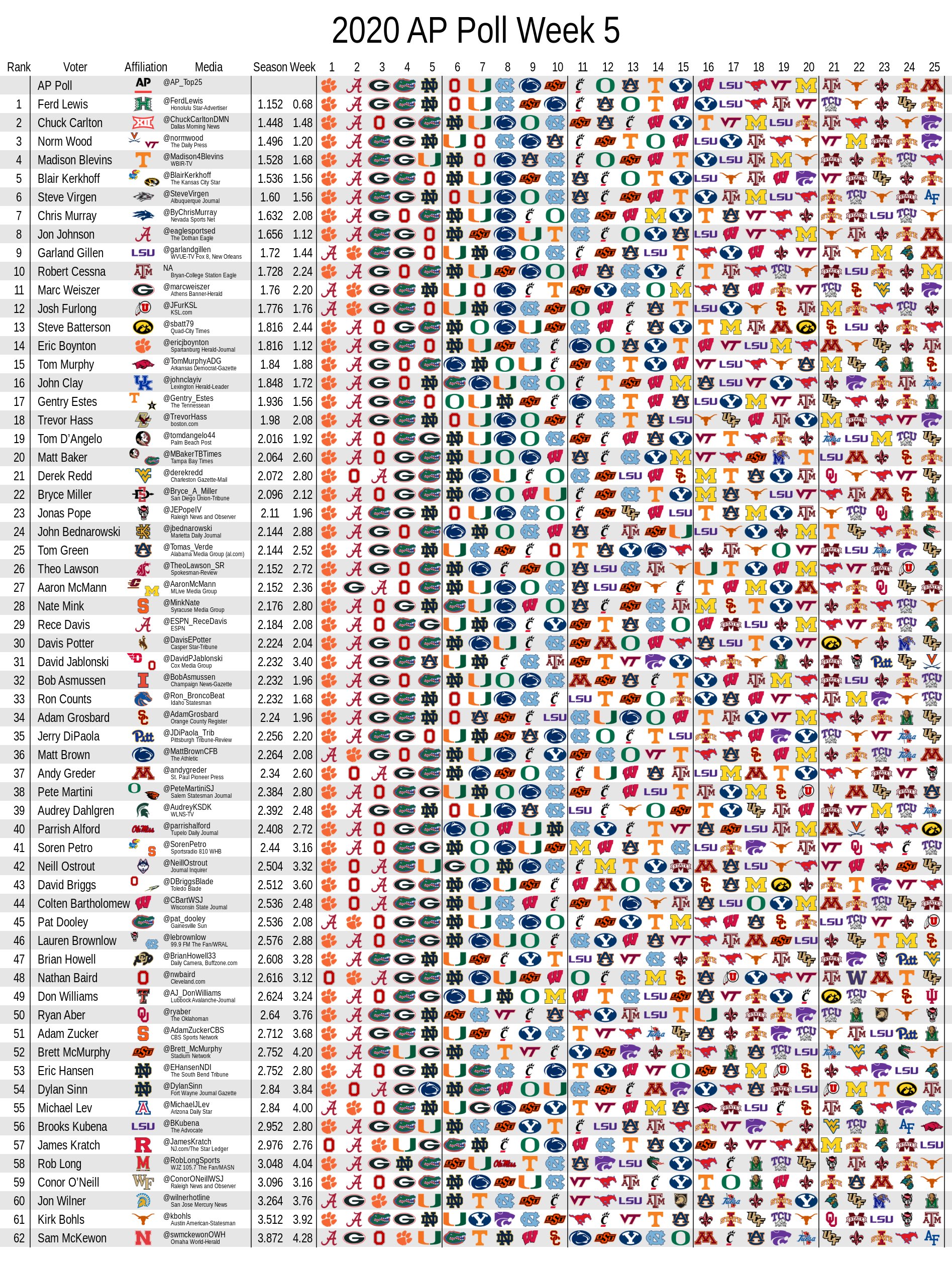 | 17 | LSU (1-1) | 20 | SEC | 478 | ||