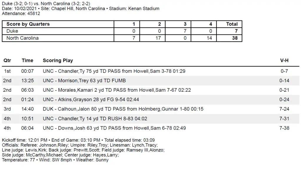 Howell connected with Chandler in the final seconds of the first quarter to break UNC’s offense out of its funk on a 75-yard scoring play. Chandler caught a pass 15 yards down field and raced up the right sideline, with the help of a Josh Downs block, to give the Tar Heels a 7–0 lead.