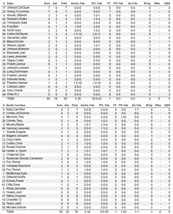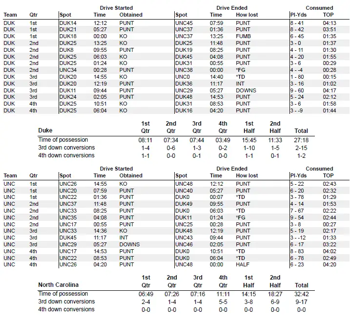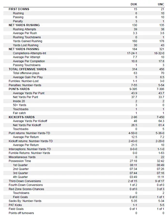 Seven points were the fewest UNC has allowed against Duke since the 19–6 victory in 2009, a win later vacated. Before that, the fewest was in a 38–0 victory in 1999.