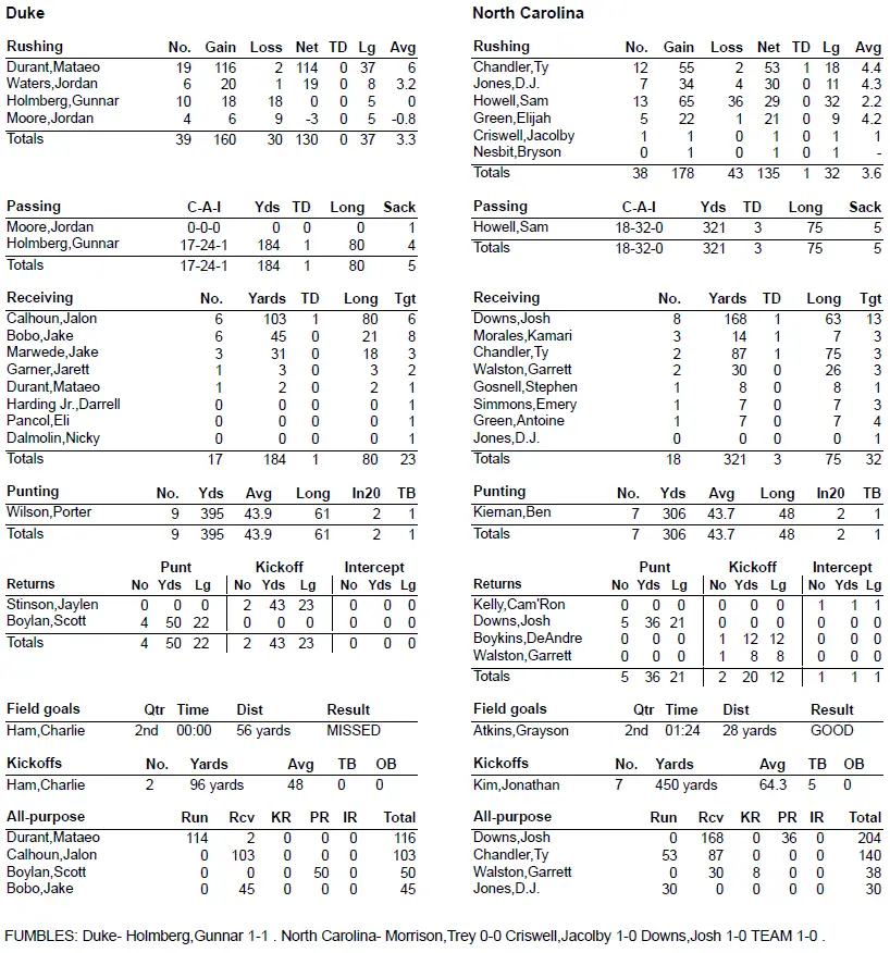 UNC made it 14–0 when Kevin Hester forced Duke quarterback Gunnar Holmberg to fumble and Trey Morrison returned it 63 yards for a touchdown. It was UNC’s first fumble return for a score since Malik Carney did it against Georgia Tech in 2018.