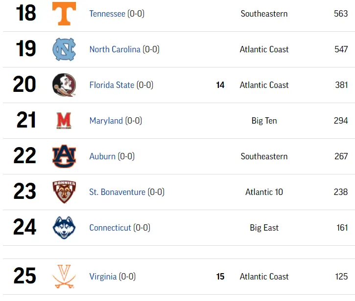 This is only the second time time since 1966 that Carolina has been ranked in double-digits in consecutive preseason polls. It also happened in 2012–13 (No. 12; the last ranking was No. 19 in week 7) and 2013–14 (No. 11; was No. 21 in the final poll.) UNC also went from a No. 19 preseason ranking in the 2001–02 season to being unranked in the 2002–03 preseason poll.