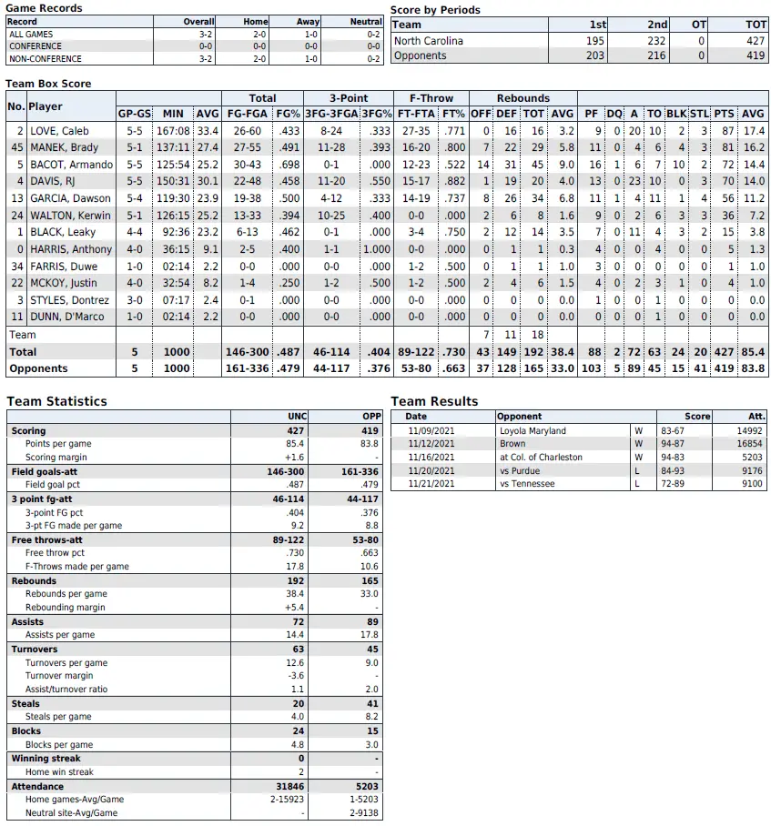 UNC season statistics