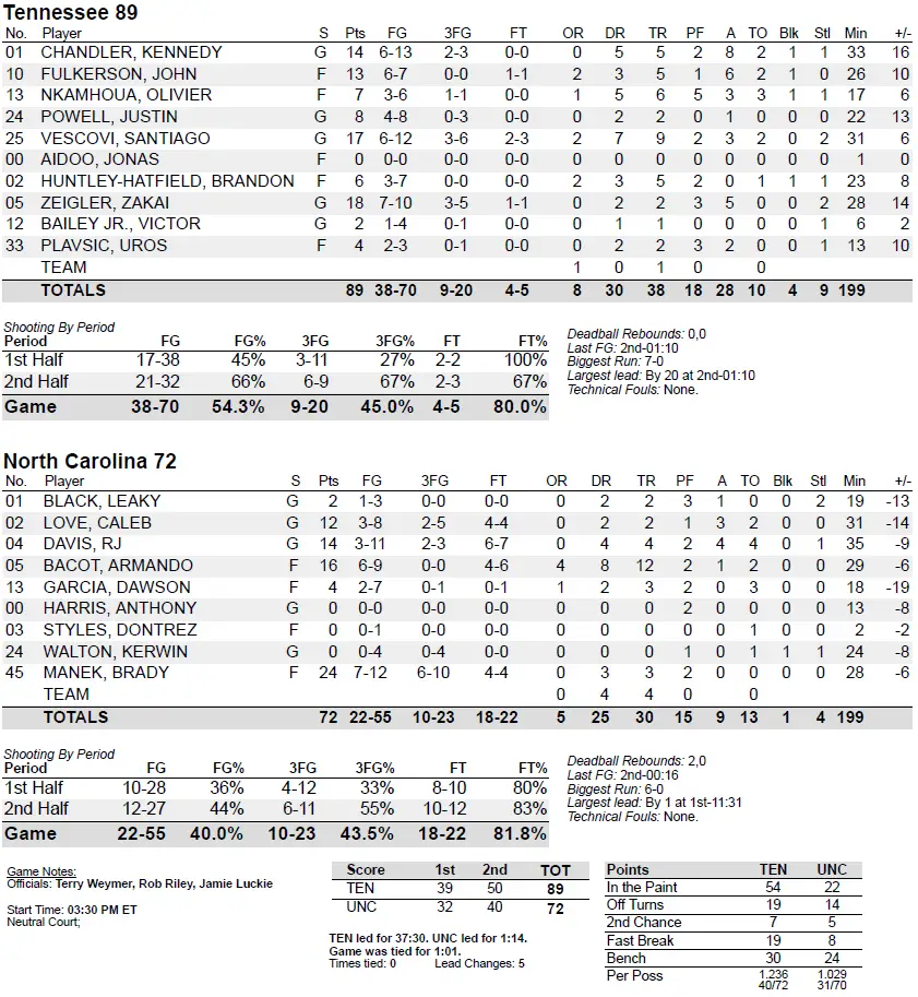 Manek generated a 6–0 run with two of his first-half 3-pointers to pull Carolina within three with 1:50 left in the first half. But the Vols took a 39–32 halftime lead, marking the fourth consecutive game that UNC has trailed at halftime.