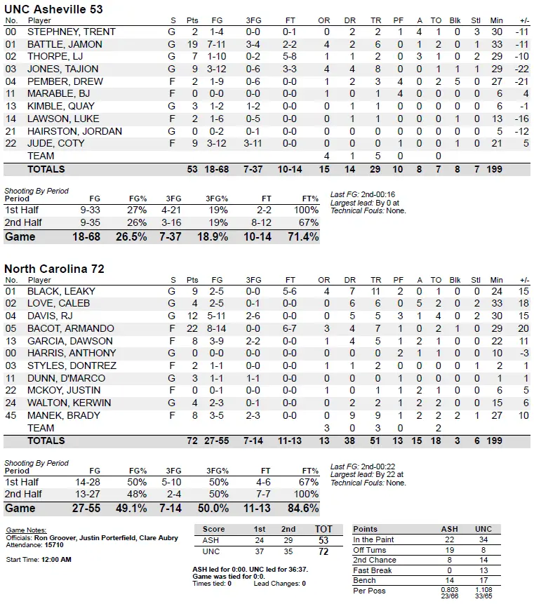 It took 2:11 for a Dawson Garcia 3-pointer to mark the first points of the game. A 12–0 UNC run, sparked by two 3-pointers from Manek and one from Davis, made it 17–5 after seven minutes. Carolina led by as many as 20 points in the first half before UNCA trimmed its deficit to 37–24 by halftime.