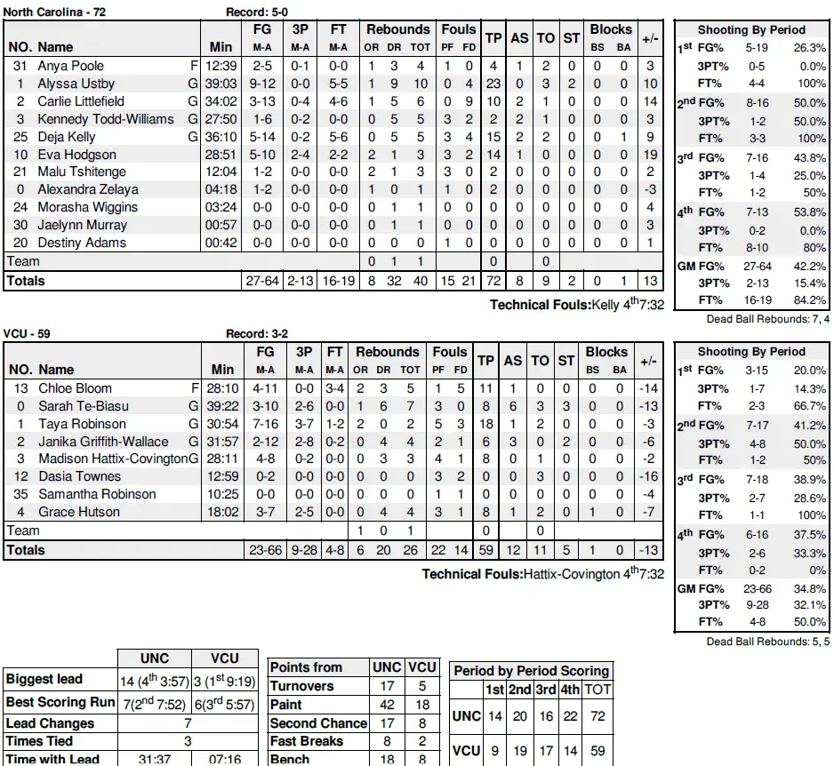 The Tar Heels led by as many as 10 points in the second quarter but VCU pulled within three on a Janika Griffith-Wallace 3-pointer with 1:38 left. Ustby scored five of her 13 first-half points after that, though, as UNC led 34–28 at halftime, shooting 37% from the floor.