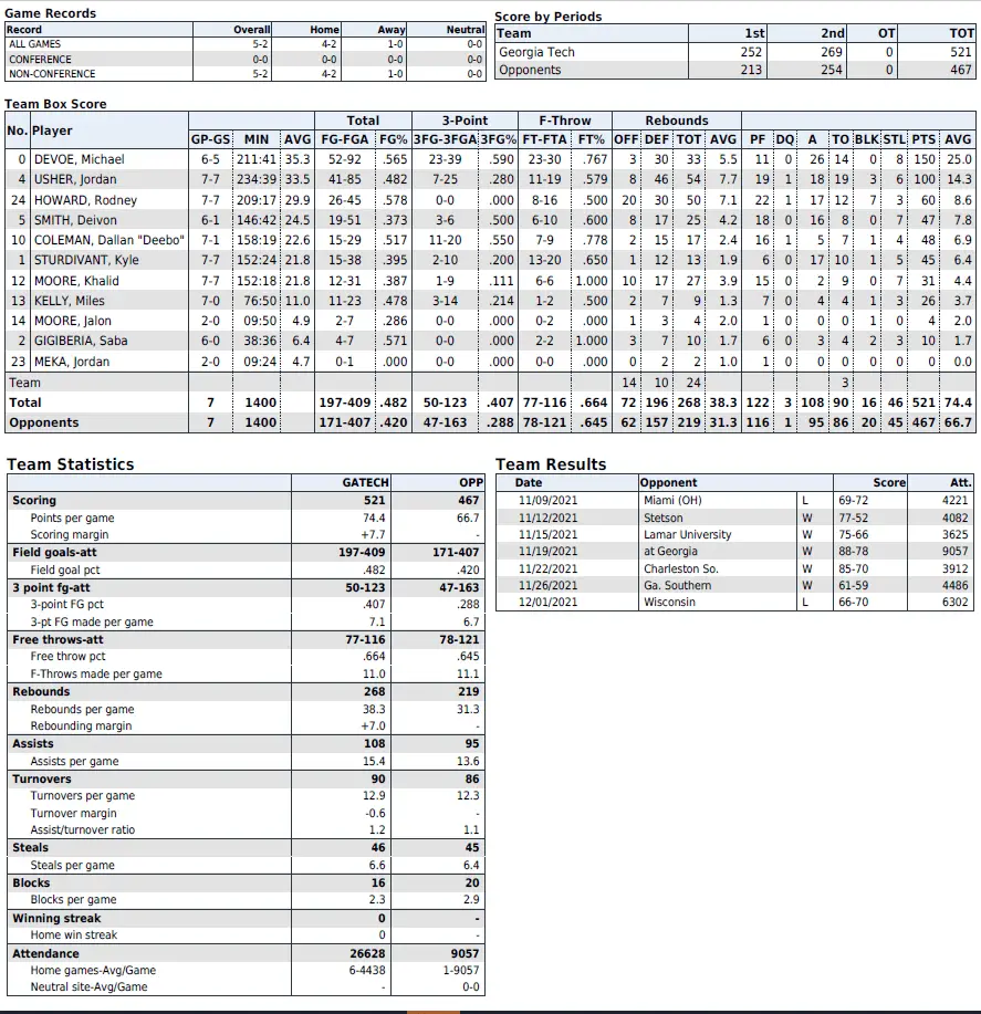 Devoe scored a career-high 37 points in an 88–78 win Nov. 19 at Georgia and 33 points Wednesday in the Jackets’ 70–66 home loss in the Big Ten/ACC Challenge against No. 23 Wisconsin. Devoe played all 40 minutes against the Badgers, scoring five 3-pointers.