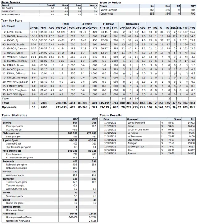 UNC season statistics