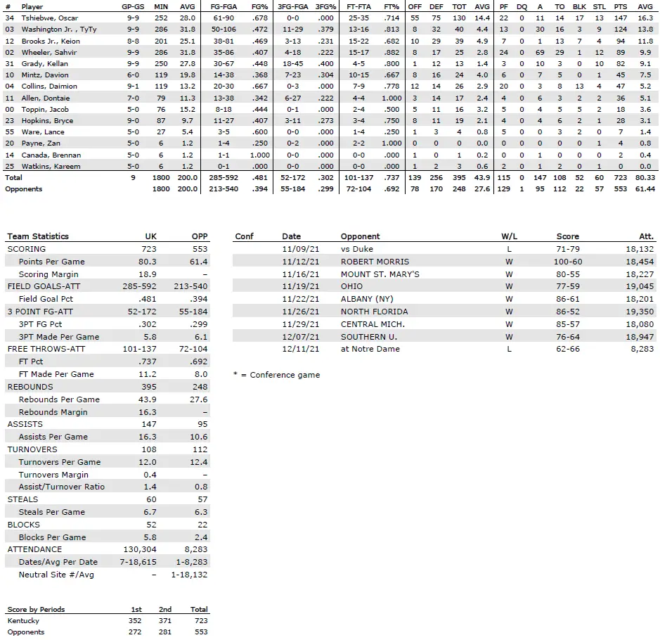 Junior forward Oscar Tshiebwe (6–9, 255 pounds), who transferred from West Virginia, leads Kentucky, averaging 16.3 points and a nation-leading 14.4 rebounds per game. He also leads the country in offensive rebounding percentage (25.2%) and offensive rebounds per game (6.1). In nine games, he has 17 blocks.