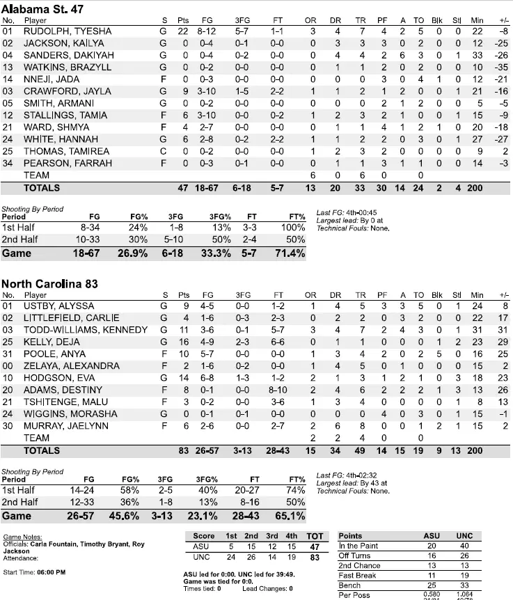It took Poole less than a minute to score four points but it took Alabama State 7:25 to top that with its fifth point. The Hornets came out buzzing in the second quarter, though, with a 13–9 run to trim what had been a 22-point lead to 17. UNC outscored Alabama State 15–2 in the rest of the quarter and led 50–20 at halftime.