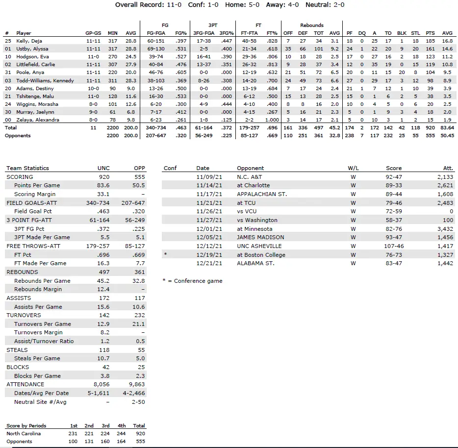 UNC season statistics