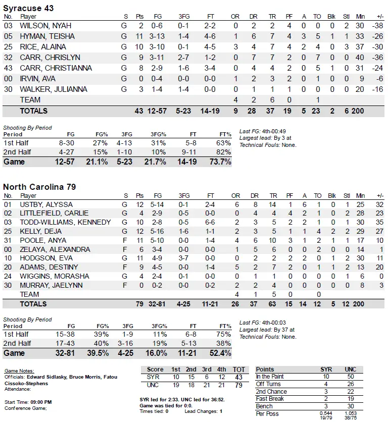 After taking a 37–25 halftime lead, the Tar Heels blew the game open by outscoring Syracuse 21–6 in the third quarter to take a 58–31 lead into the final quarter.
