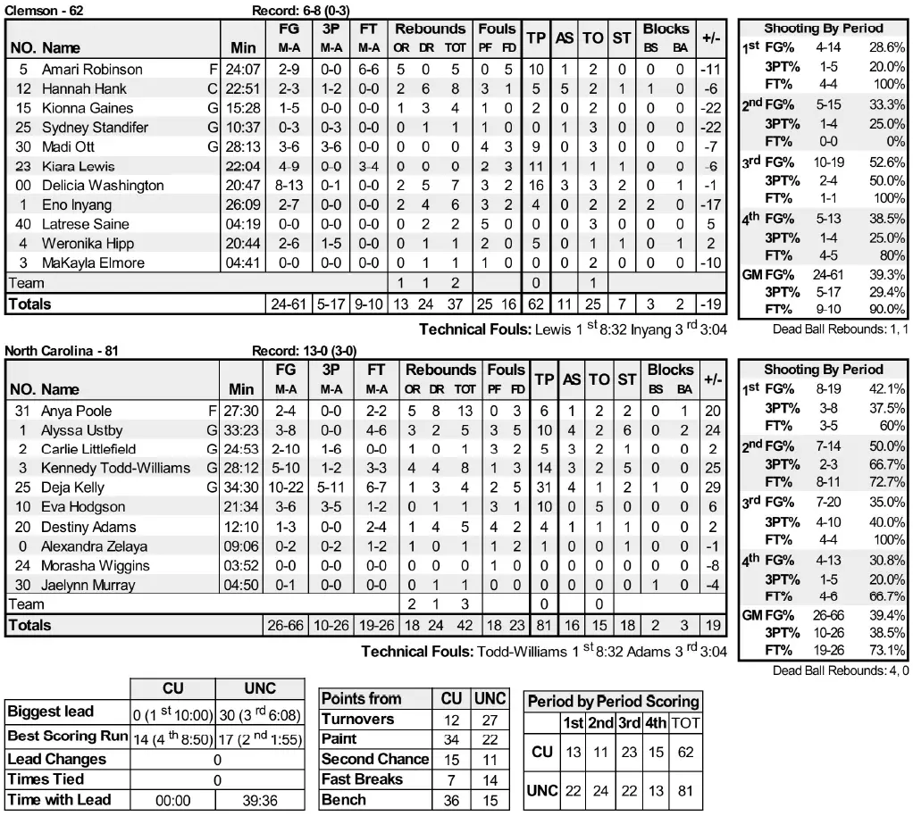 The Tigers responded with a 7–0 run, but they had four field goals and six turnovers and trailed 22–13 after one quarter. Clemson scored the first five points of the second quarter to cut its deficit to four before that 19–2 run pushed UNC’s lead to 46–24 by halftime.