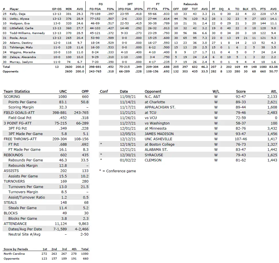 The No. 24 Tar Heels led by 30 points in the third quarter before winning 81–62 Sunday at Carmichael Arena behind Deja Kelly’s career-high 31 points. They now get a chance to prove how good they are when they visit No. 5 N.C. State on Thursday night. That will give UNC (13–0, 3–0 ACC) their toughest test of the season and their first ranked opponent.