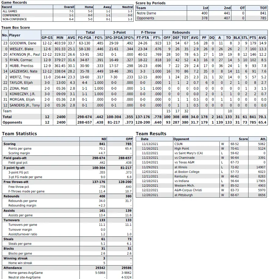 Notre Dame has plenty of experience in its rotation with the exception of 6–5 freshman guard Blake Wesley, who is averaging 13.3 points per game.