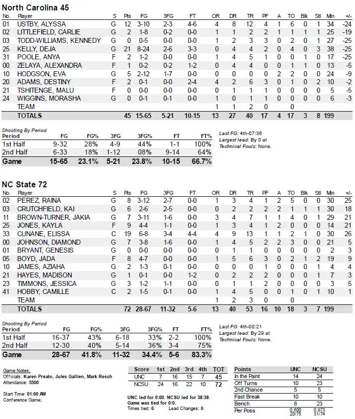 A seasoned, experienced opponent will make you pay and No. 5 N.C. State (13–2, 4–0 ACC) cashed in early on its way to an easy 72–45 victory Thursday at Reynolds Coliseum to end UNC’s unbeaten streak at 13.