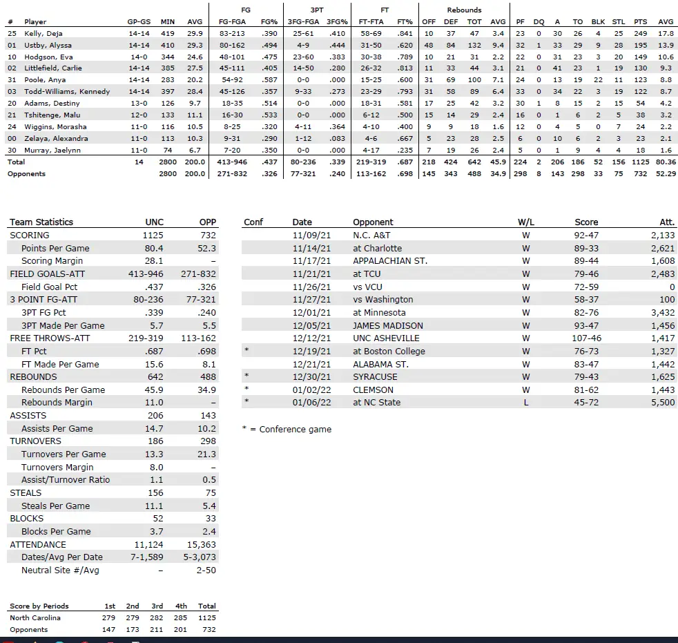 After trailing by more than five points only once in the first 13 games (15 points in the come-from-behind win at Boston College), the Tar Heels trailed by as many as 29 points. Before Thursday, UNC’s fewest points in a game came in a 58–37 victory over Washington. It was the lowest total since scoring a 62–44 loss to Duke in March 2019.