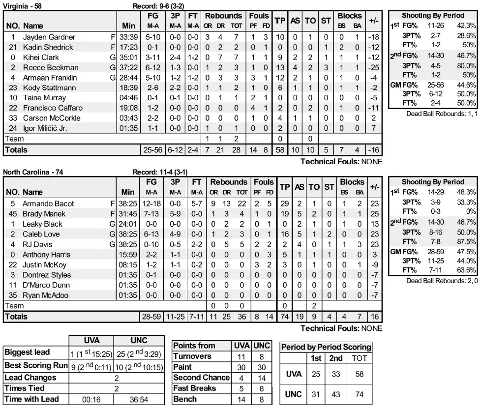 The most effective weapon against Virginia on Saturday, though, was Armando Bacot, who couldn’t be stopped and had career-highs of 29 points and 22 rebounds.