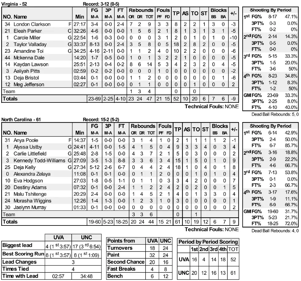 Virginia offered that rare night, and No. 20 North Carolina (15–2, 5–2 ACC) did all four in a 61–52 victory Thursday night at Carmichael Arena. The Cavaliers didn’t make it easy at the end, though, coming within seven points late.