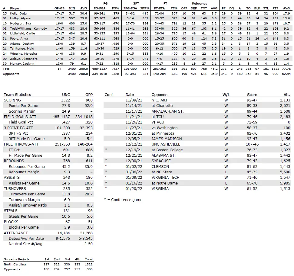 It didn’t last, even as Banghart played more of her bench than usual, and did it early. She used eight players in the opening quarter and all 11 got in by late in the first half. The Tar Heels, 9–0 at home, have led for 353 minutes and 32 seconds of 360 minutes in nine home games.