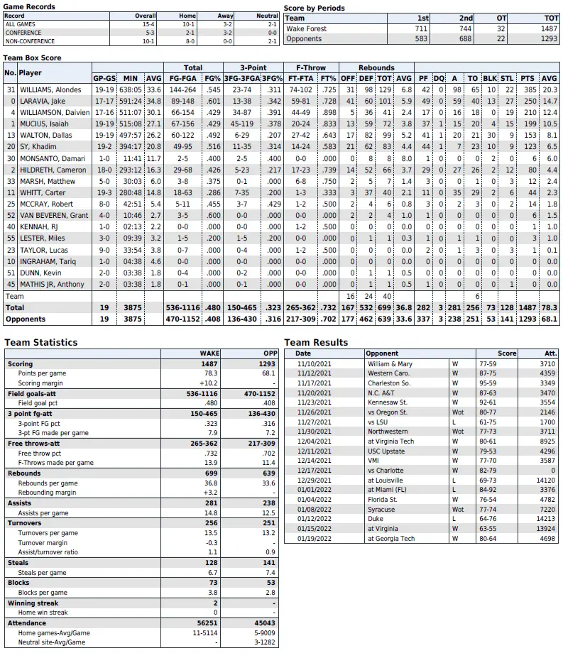 Wake Forest season statistics