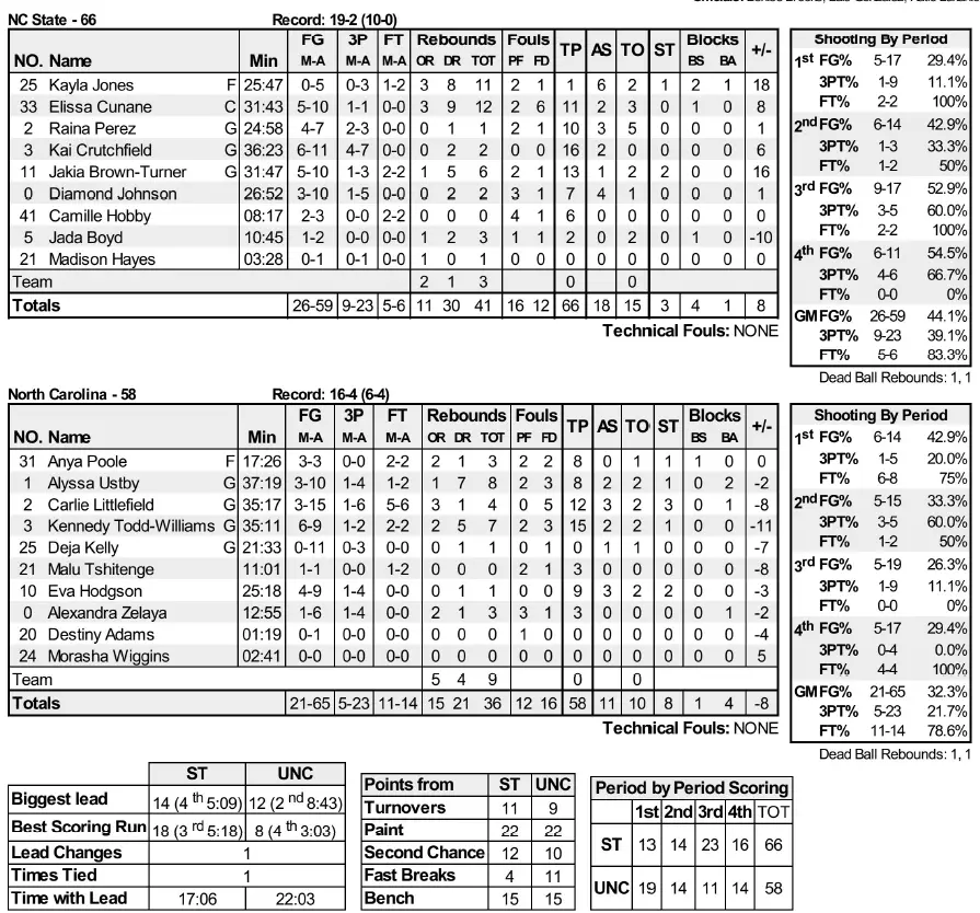 UNC shot 37.3% in the first half and led by six at halftime but dipped to 26.3% in the pivotal third quarter. After State built a 14-point third-quarter lead, Carolina responded. An 8–0 UNC run pulled the Tar Heels within six on an Anya Poole layup with 3:03 left. A pair of Carlie Littlefield free throws cut it to five with 1:24 left, but they couldn’t come any closer after that.