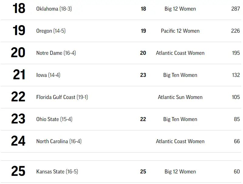 Mississippi was No. 24 but is now unranked after losing No. 1 South Carolina 69–40 and to No. 15 Georgia 62–52.