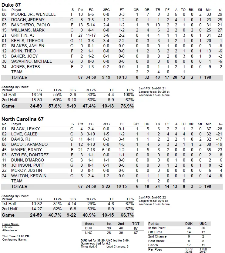 UNC was 1 of its first 7 before a Manek 3-pointer. By the time the Tar Heels scored again on a Bacot bucket more than 4½ minutes later, they trailed 31–10. With Bacot sitting for more than seven first-half minutes, Duke scored 18 points inside in the first half.