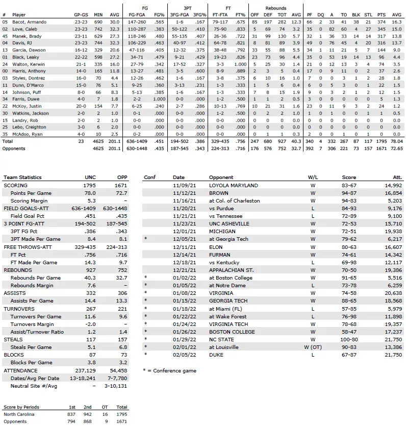 UNC season statistics