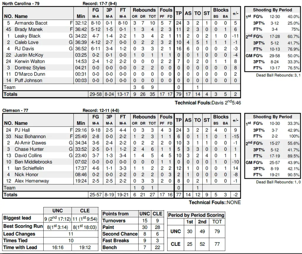 UNC 79, Clemson 77