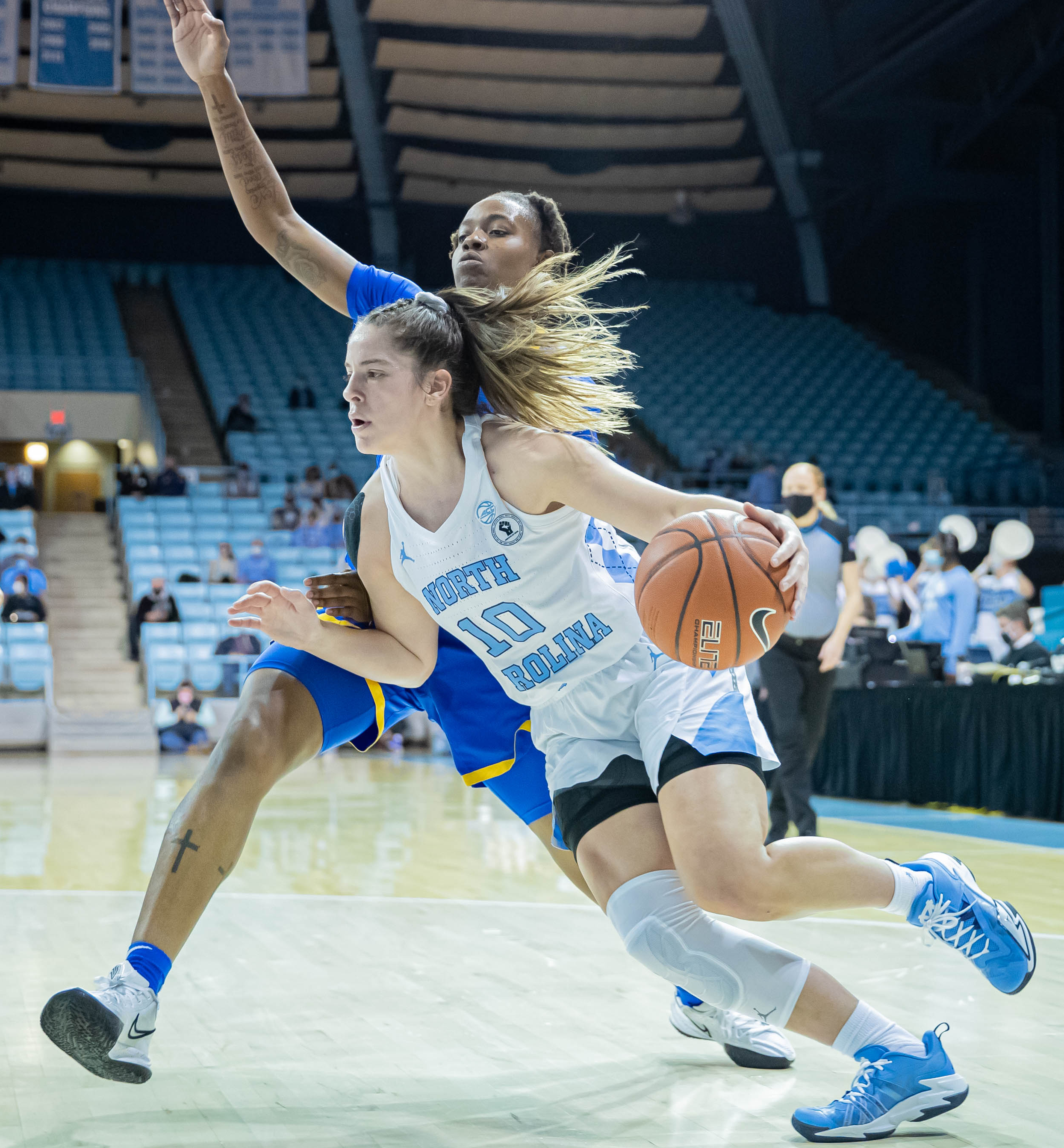 Pittsburgh’s 6–4 center Rita Igbokwe can be an intimidating presence inside. She did block five shots but Carolina did a good job of passing out of double-teams inside to create good shots. Against the best rebounding team in the league, UNC won the boards 43–36. The Panthers only had eight offensive rebounds, half of their average.