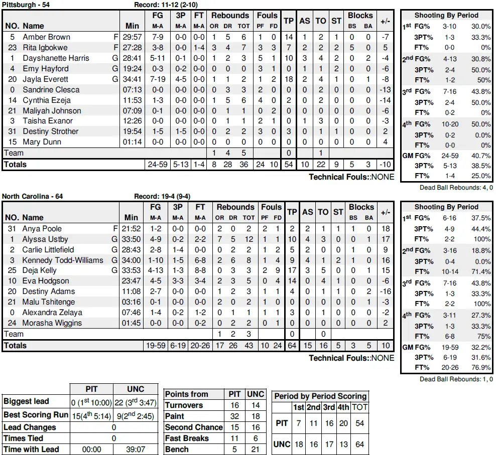 Carolina started the second half slowly, but Kelly’s five points sparked an 11–2 run to push the lead to 22 and the Heels took a 51–34 edge into the final quarter. Pittsburgh scored the first 10 points of the final quarter to trim its deficit to seven before Hodgson’s 3-pointer ended the run.