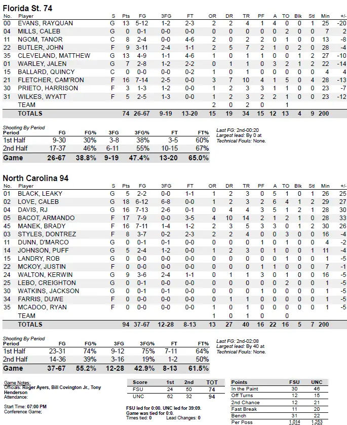 UNC 94, Florida State 74