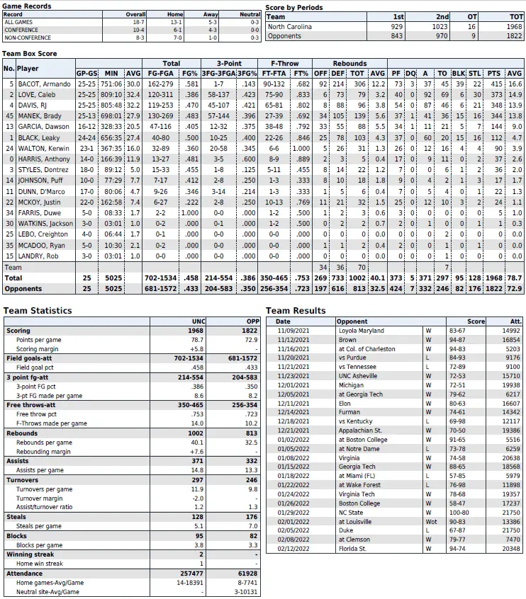 UNC season statistics