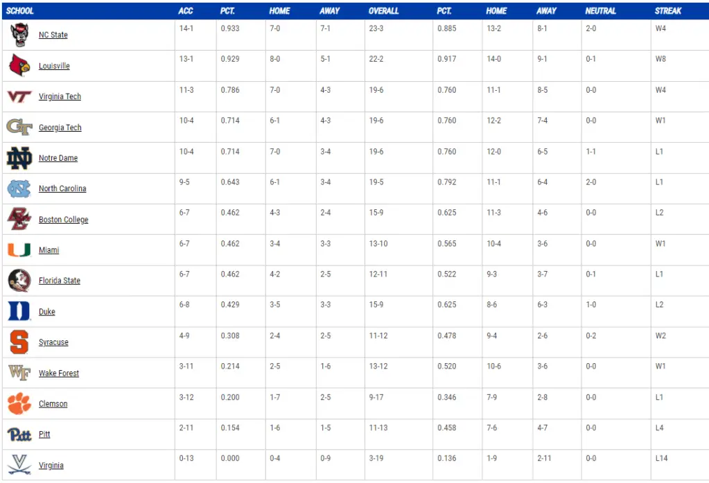 | 30 | 66–58 loss, 16–4, 6–4 | Home | No. 5 N.C. State |