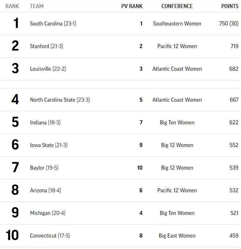Louisville (22–2, 13–1), which visits UNC on Thursday at 6 p.m. (regional sports networks), stayed at No. 3 after a win by forfeit over Virginia and blowing out Notre Dame on Sunday at home 73–47. The Irish (19–6, 10–4), who beat Miami 64–54 on Thursday, fell from one spot to No. 19.
