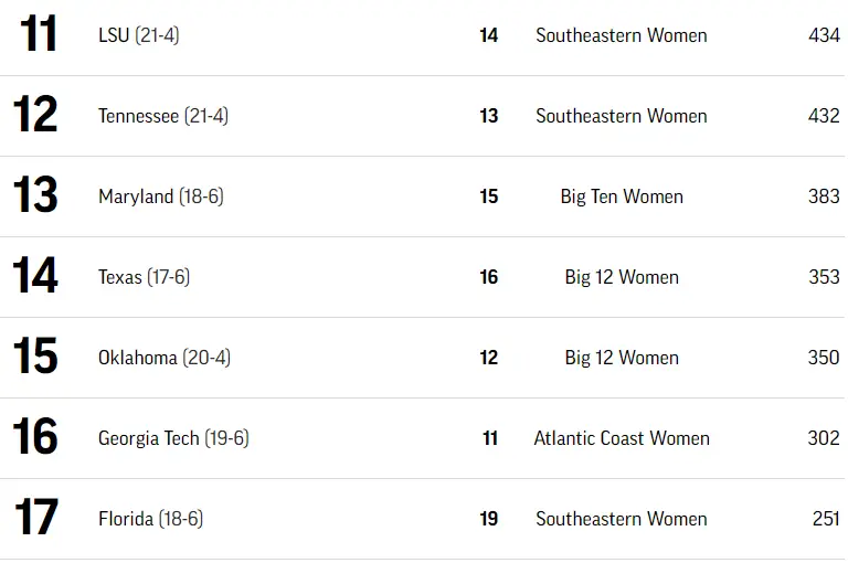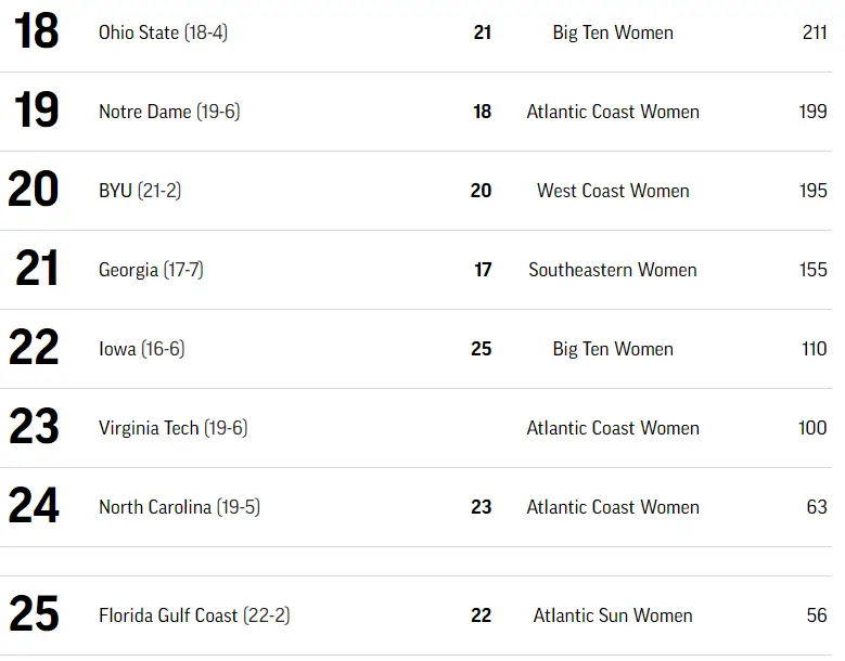 The Yellow Jackets (19–6, 10–4) fell five spots to No. 16 after also losing to 59–48 to N.C. State. The Wolfpack (23–3, 14–1) went up one spot to No. 4 after also beating Boston College 85–78 and Duke 77–62.