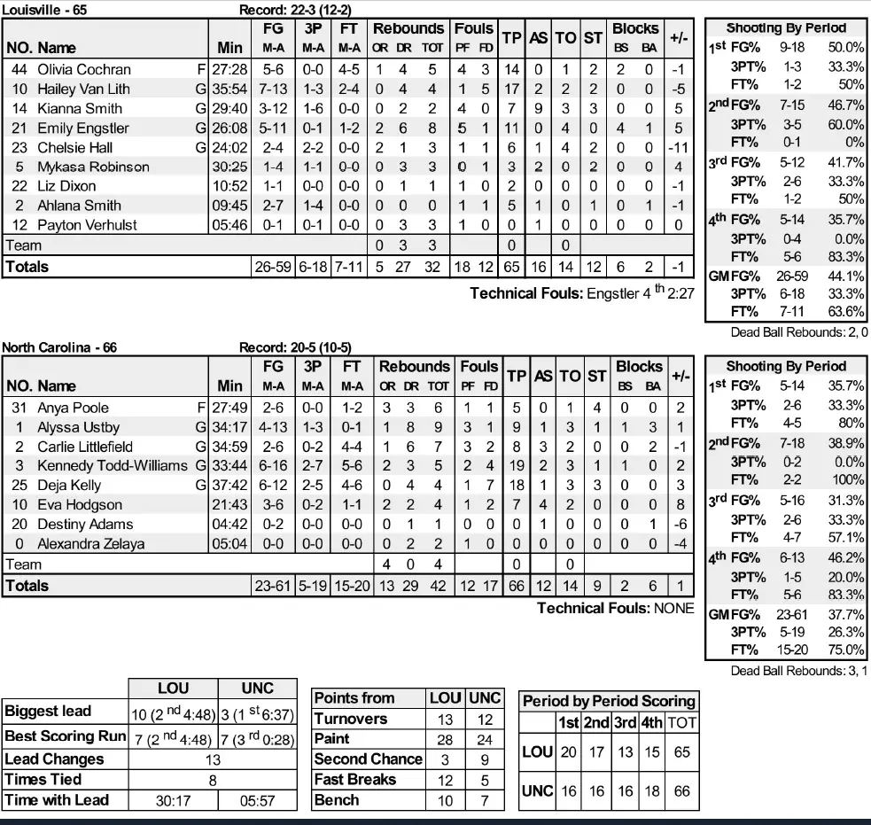 Louisville’s Emily Engstler, who scored 11 points, drew a technical foul protesting her fourth foul out with 2:27 left. Kelly split a pair of free throws to put Carolina up 62–61. Cochran’s two free throws gave Louisville a brief lead before Kelly’s short jumper with 22.2 seconds left made it 64–63 UNC.