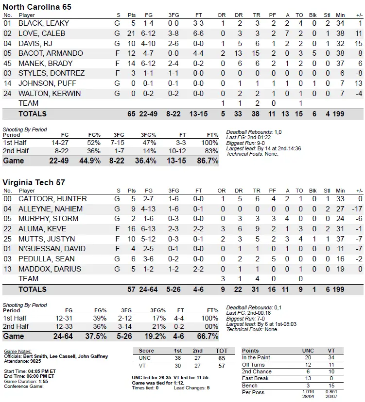Carolina (19–8, 11–5 ACC) weathered a sloppy second-half scoring drought of more than seven minutes on its way to a huge 65–57 win at Cassell Coliseum. It was the sixth time UNC has held an opponent to fewer than 60 points this season but the first time on the road as the Hokies scored a season-low 57 points at home.