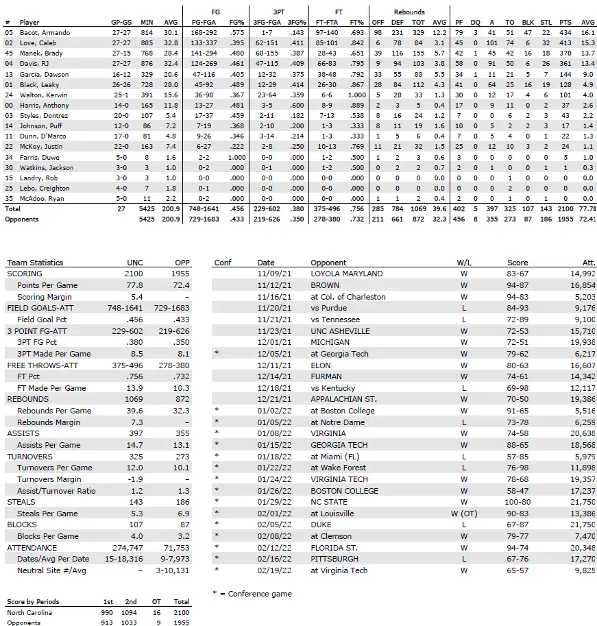 UNC held Virginia Tech to a season-low 5 of 26 from 3-point range (19.2%). The Hokies were second in the country in 3-point field-goal percentage (40.9%) coming into the game.