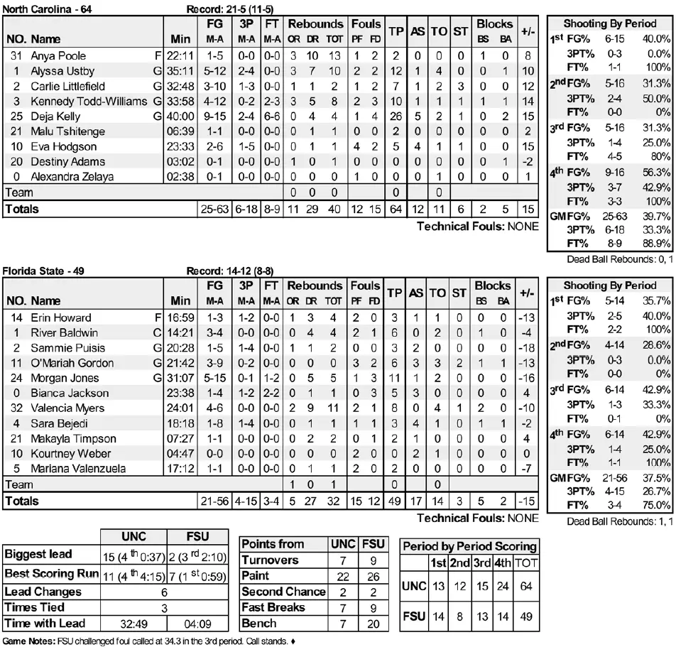 Usby’s 3-pointer with 1:32 left in the third quarter ended a 6½-minute UNC field-goal drought to start a 5–0 run and go ahead 38–35 after FSU had taken a brief two-point lead.