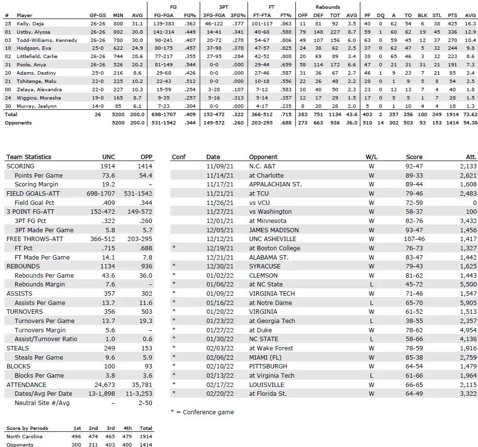 Several players made big second-half shots, but Ustby pointed an inside bucket from reserve center Malu Tshitenge in the final seconds of the third quarter off of an Eva Hodgson pass that gave the Heels a 40–35 lead.