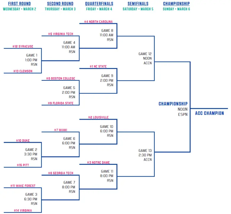 | 5 | noon Saturday, ACCN | Greensboro | Semifinals (with win Friday) |