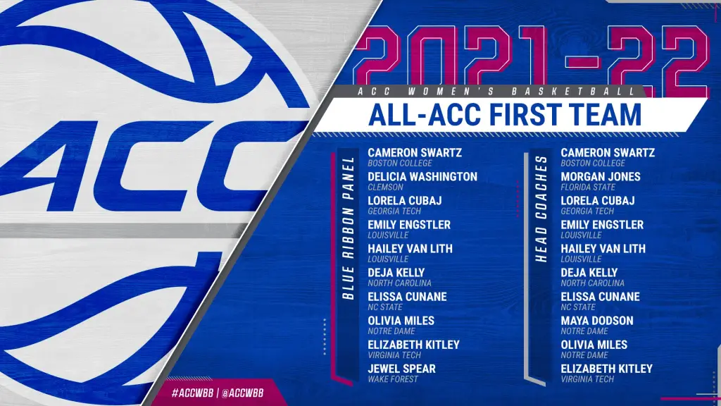 Also on the coaches’ first team are Boston College guard Cameron Swartz, Florida State guard Morgan Jones, Georgia Tech forward Lorela Cubaj, Louisville forward Emily Engstler, Louisville guard Hailey Van Lith, N.C. State center Elissa Cunane, Notre Dame forward Maya Dodson and Notre Dame guard Olivia Miles. The Blue Ribbon first team includes Clemson’s Delicia Washington, Notre Dame’s Olivia Miles and Wake Forest’s Jewel Spear, as well as Kelly, Swartz, Cubaj, Engstler, Van Lith, Cunane and Kitley.