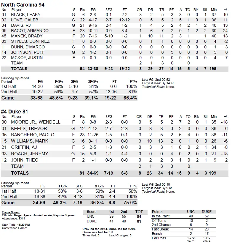 After a quick Duke turnover and Bacot’s slam to start the game, UNC was off and running. Carolina took a 9–2 lead on a Manek 3-pointer and a pair of Love free throws in the first 3½ minutes, and had an 11–4 edge at the first TV timeout. Paulo Banchero scored six points in a 10–4 run with Bacot on the bench to trim the lead to one by the second TV timeout.
