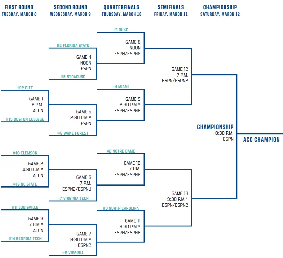 UNC (23–8, 15–5 ACC) will play in the quarterfinals at 9:30 Thursday night (ESPN). The Tar Heels will face the winner of Wednesday’s 9:30 game between No. 6 Virginia and the winner of Tuesday’s 7 p.m. game between No. 11 Louisville and No. 14 Georgia Tech.