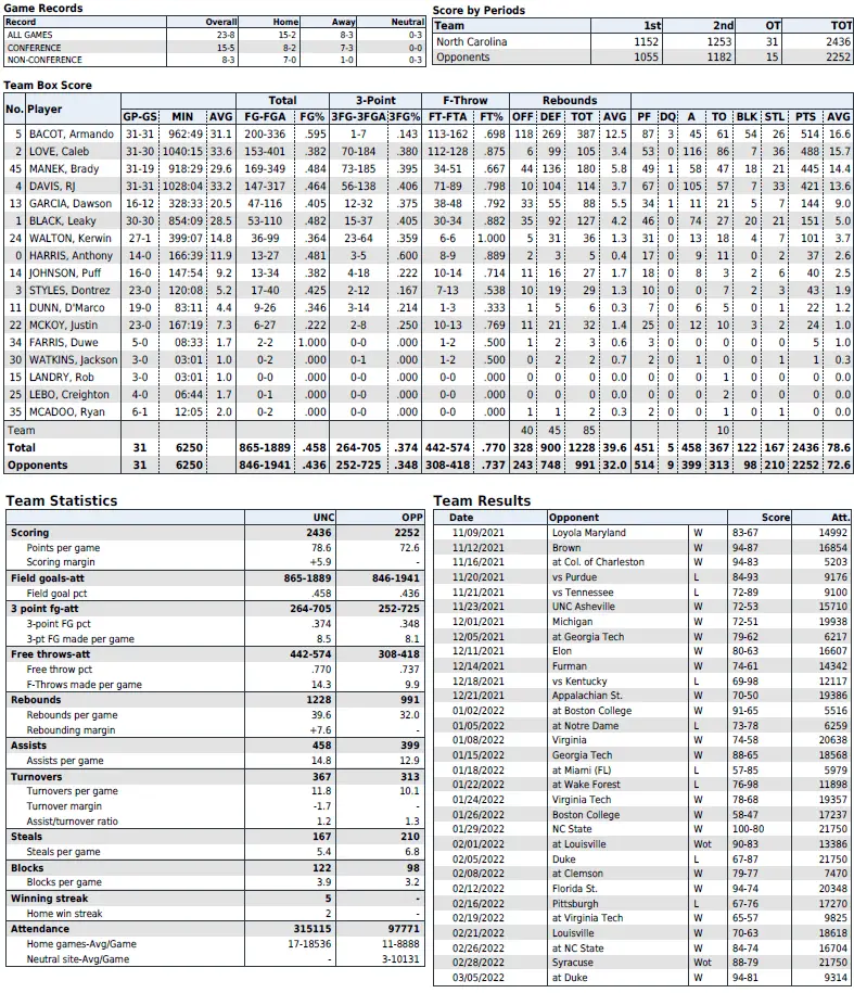 UNC season statistics