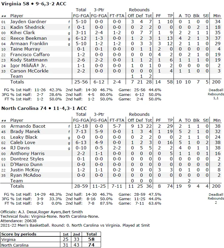 In Virginia’s loss at UNC, Reece Beekman led the Cavaliers with 13 points.