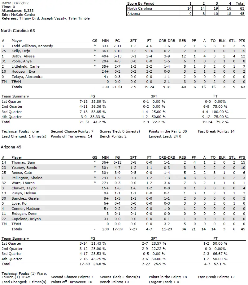After the Wildcats cut UNC’s lead to seven, a Todd-Williams 3-pointer and a Kelly jumper pushed the advantage back to 12. After a 3-pointer from Arizona’s Bendu Yeaney, Kelly scored six of UNC’s 14 consecutive points to balloon the lead to 24 points early in the fourth quarter after leading 47–27 through three quarters.