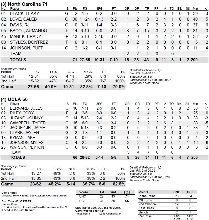 Love scored 12 consecutive UNC points in one second-half stretch and his back-to-back 3-pointers in the last 1:40 propelled the No. 8-seed Tar Heels to a 73–66 victory over No. 4-seed and 11th-ranked UCLA on Friday night in an East Regionals semifinal at the Wells Fargo Center.