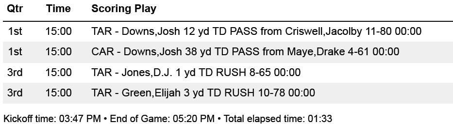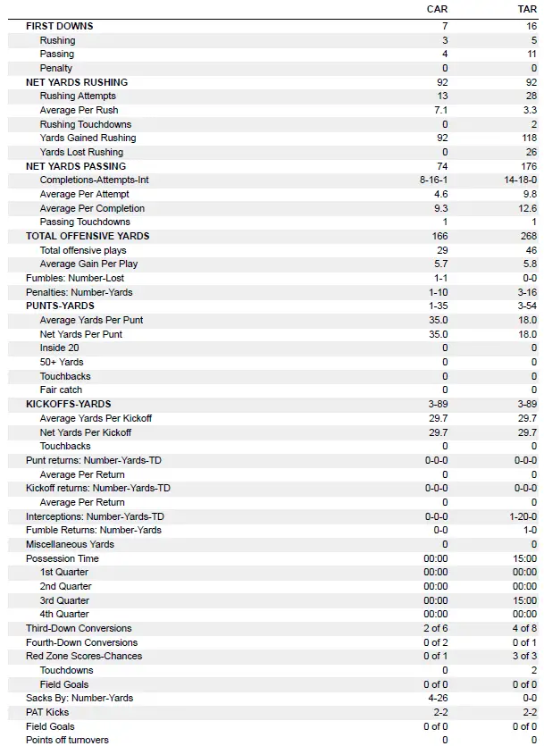 Antoine Green’s 36-yard run keyed a 53-yard drive for the Carolina team to produce a scoring drive that ended with his 3-yard TD run to tie the game at 14. Green led the game with 61 rushing yards on nine carries.